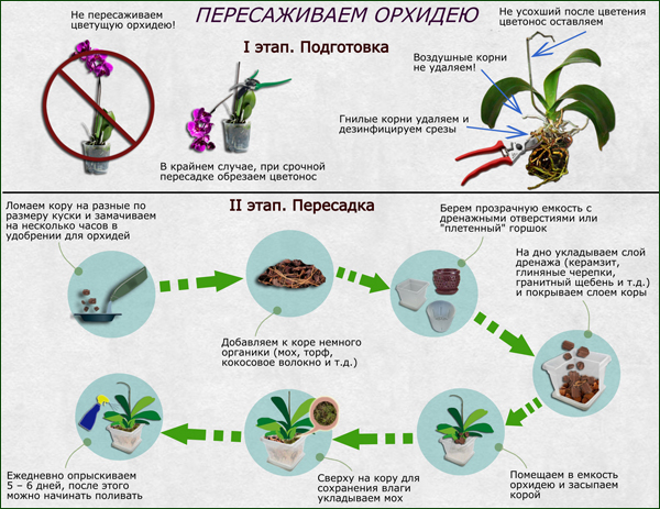 Поэтому для пересадки орхидеи следует выполнить следующие операции:
